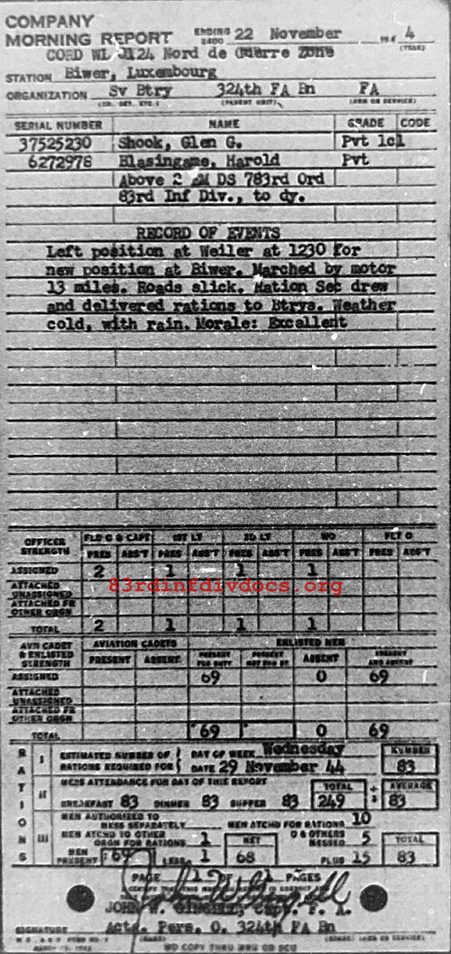 Left position at Weiler at 1230 for new position at Biwer. Marched by motor 13 miles. Roads slick. Ration Sec drew and delivered rations to Btrys. Weather: Cold with rain. Morale: Excellent.