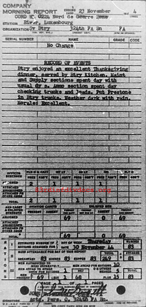 Btry enjoyed an excellent Thanksgiving dinner, served by Btry Kitchen. Maint and Supply sections spent day with usual dy's. Ammo section spent day checking trucks and loads. Put Prestone in Btry trucks. Weather: Dark with rain. Morale: Excellent.