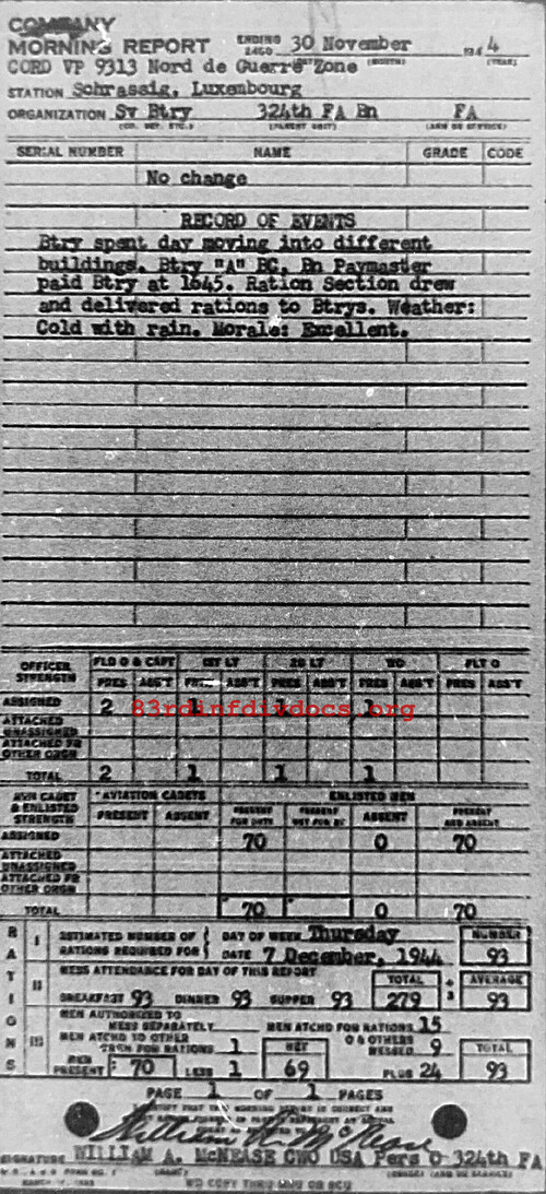 Btry spent day moving into different buildings. Btry 'A' BC, Bn Paymaster paid Btry at 1645. Ration Section drew and delivered rations to Btrys. Weather: Cold with rain. Morale: Excellent.
