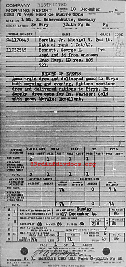 Ammo section drew and delivered ammo to Btrys both morning and evening. Ration section drew and delivered rations to Btrys. Bn Supply drew cots for Bn. Weather: Cold with snow. Morale: Excellent.