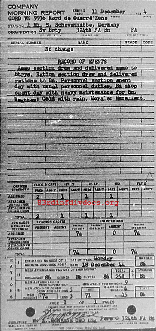 Ammo section drew and delivered ammo to Btrys. Ration section drew and delivered rations to Btrys. Personnel section spent day with usual personnel duties. Bn shop spent day with heavy maintenance for Bn. Weather: Cold with rain. Morale: Excellent.