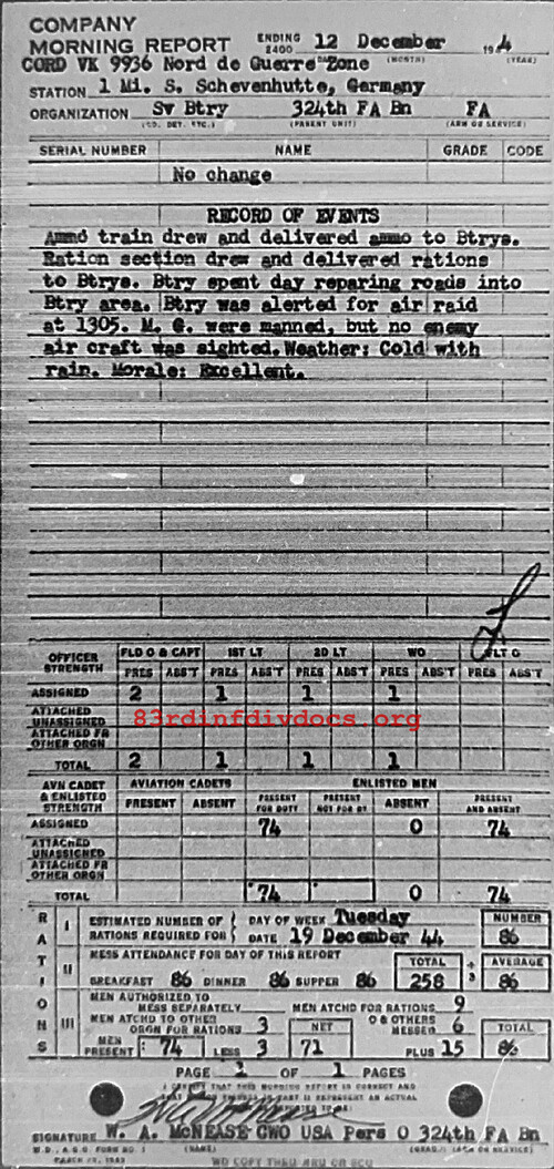 Ammo section drew and delivered ammo to Btrys. Ration section drew and delivered rations to Btrys. Btry spent day preparing roads into Btry area. Btry was alerted for air raid at 1305. M.G. were manned but no enemy air craft was sighted. Weather: Cold with rain. Morale: Excellent.