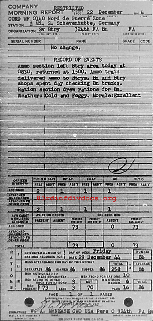 Ammo section left Btry area today at 0830, returned at 1500. Ammo train delivered ammo to Btrys. Bn and Btry shops spent days checking Bn trucks. Ration section drew rations for Bn. Weather: Cold and foggy. Morale: Excellent.