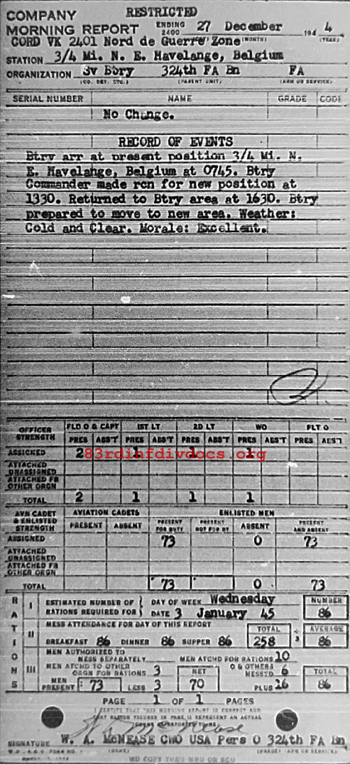 Btry arr at present position 3/4 Mi. N.E. Havelange, Belgium at 0745. Btry Commander made rcn for new position at 1330. Returned to Btry area at 1630. Btry prepared to move to new area. Weather: Cold and clear. Morale: Excellent.