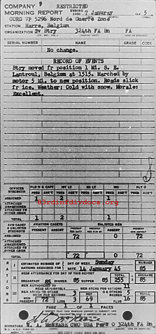 Btry moved fr position 1 Mi. S.E. Lantroul, Belgium at 1515. Marched by motor 5 Mi. to new position. Roads slick fr ice. Weather: Cold with snow. Morale: Excellent.
