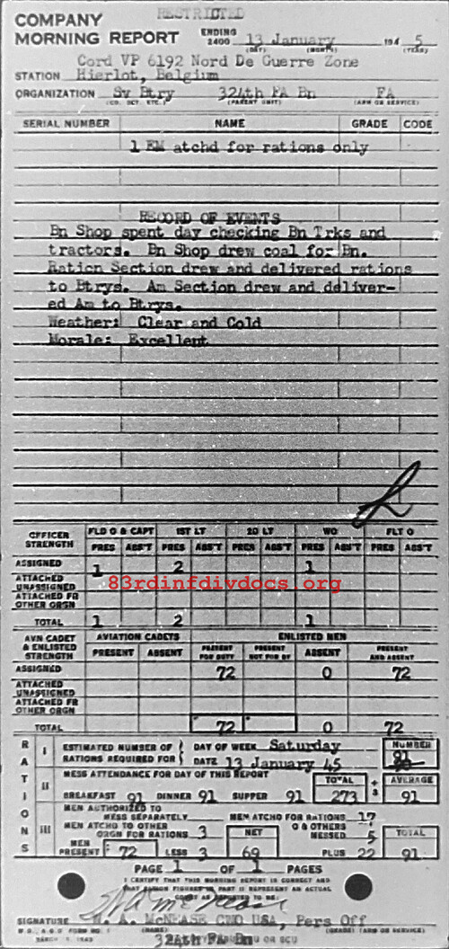 Bn Shop spent day checking Bn Trks and tractors. Bn Shop drew coal for Bn. Ration Section drew and delivered rations to Btrys. Am Section drew and delivered Am to Btrys. Weather: Clear and cold. Morale: Excellent.