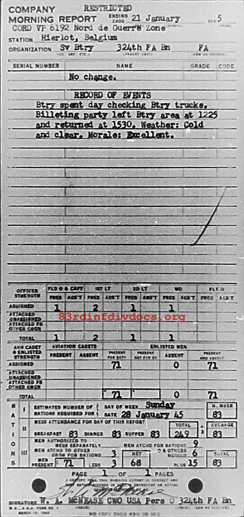 Btry spent day checking Btry trucks. Billeting party left Btry area at 1225 and returned at 1530. Weather: Cold and clear. Morale: Excellent.