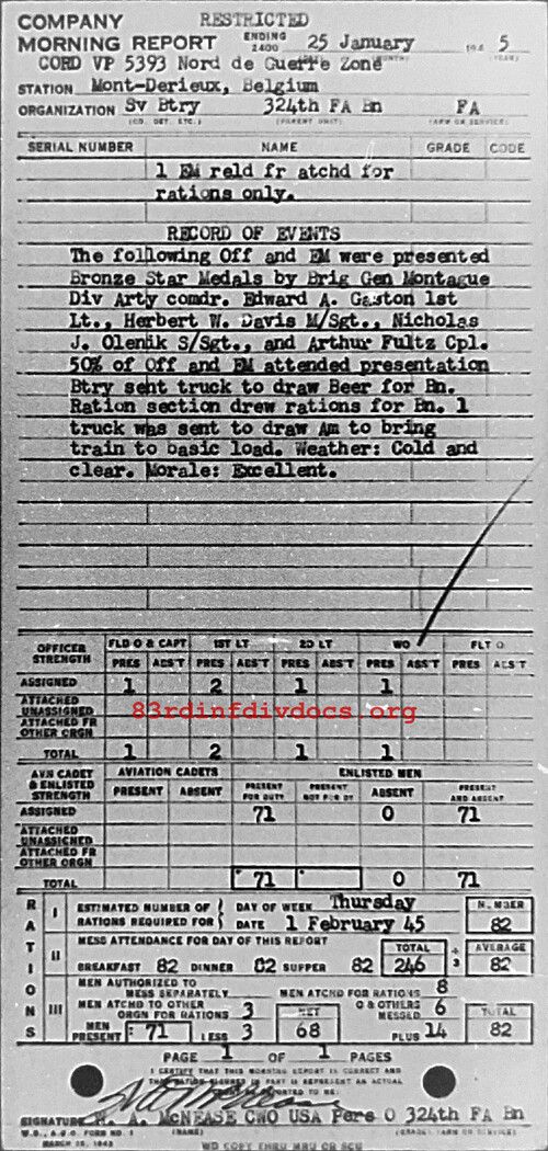 The following Off and EM were presented Bronze Star Medals by Brig Gen Montague Div Arty comdr. Edward A Gaston 1st Lt, Herbert W Davis M/Sgt, Nicholas J Olenik S/Sgt, and Arthur Fultz Cpl, 50% of Off and EM attended presentation Btry sent truck to draw Beer for Bn. Ration section drew rations for Bn. 1 truck was sent to draw Am to bring train to basic load. Weather: Cold and clear. Morale: Excellent.