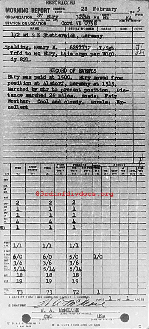 Btry was paid at 1500. Btry moved from position at Alsdorf, Germany at 1515. Marched by mtr to present position. Distance marched 26 miles. Roads: Fair. Weather: Cool and cloudy. Morale: Excellent.