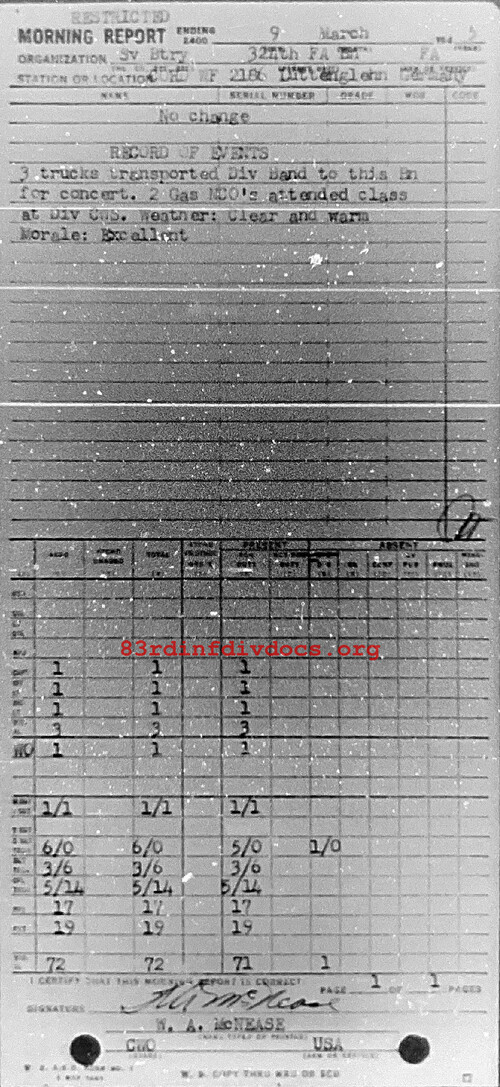 3 trucks transported Div Band to this Bn for concert. 2 Gas NCO's attended class at Div CWS. Weather: Clear and warm. Morale: Excellent.