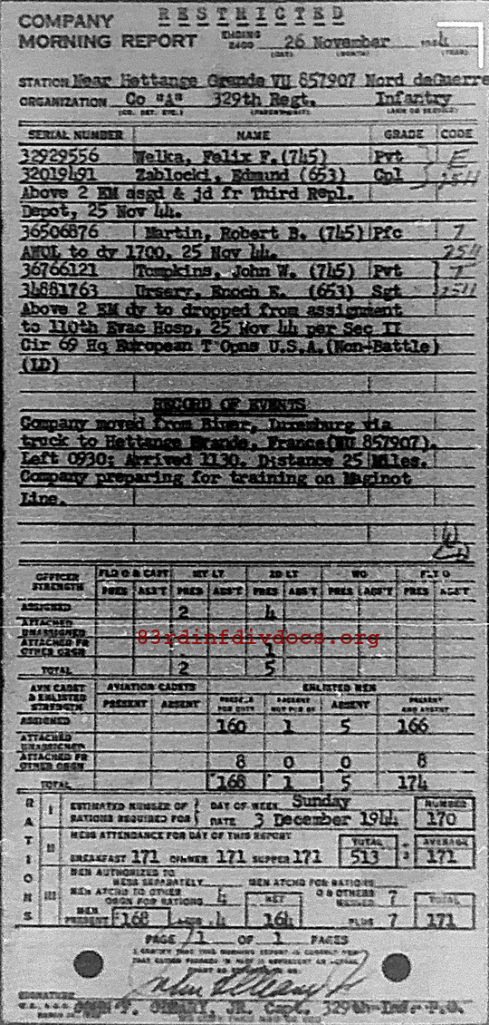 Company moved from Biwer, Luxembourg via truck to Hettange Grande, France (vU857907). Left 0930: Arrived 1130. Distance 25 Miles. Company preparing for training on Maginot Line.