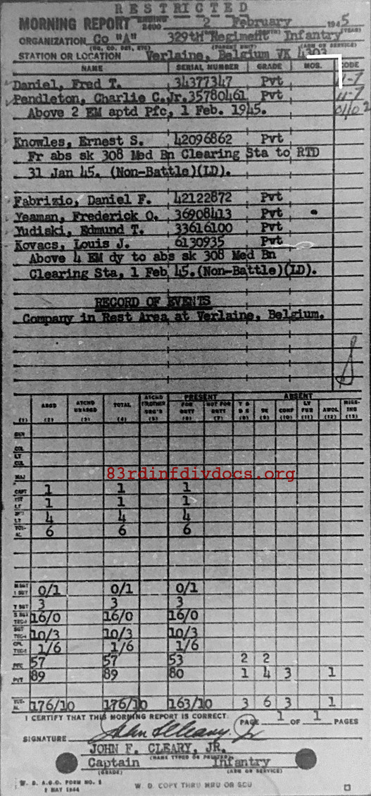 Morning report A/329 for February 2, 1945