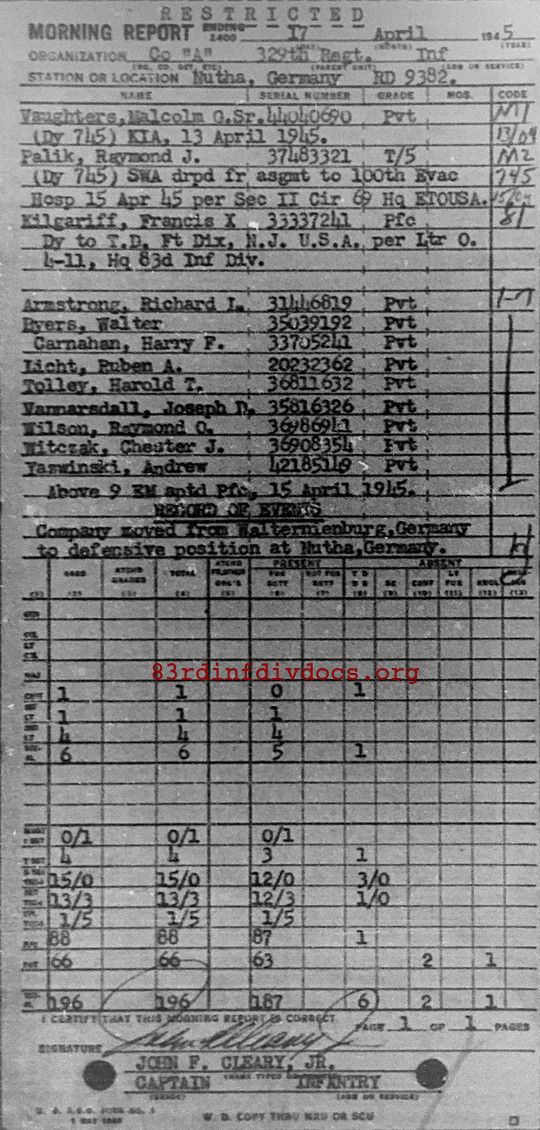 Company moved from Walternienburg, Germany to defensive position at Nutha, Germany.