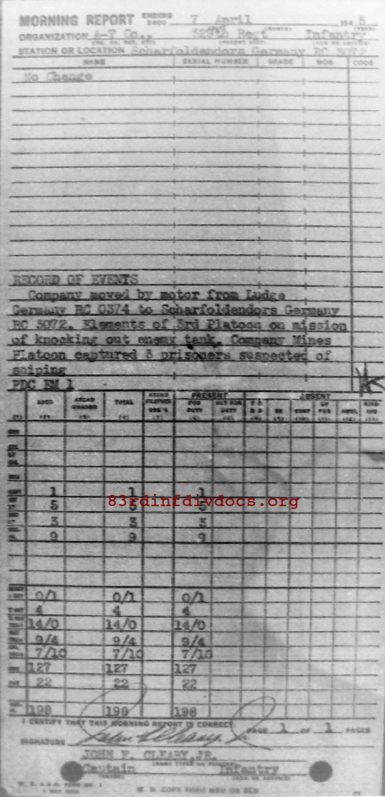 Company moved by motor from Ludge Germany RC0374 to Scharfoldendors, Germany RC3072. Elements of 3rd Platoon on mission of knocking out enemy tank. Company Mines Platoon captured 3 prisoners suspected of sniping.