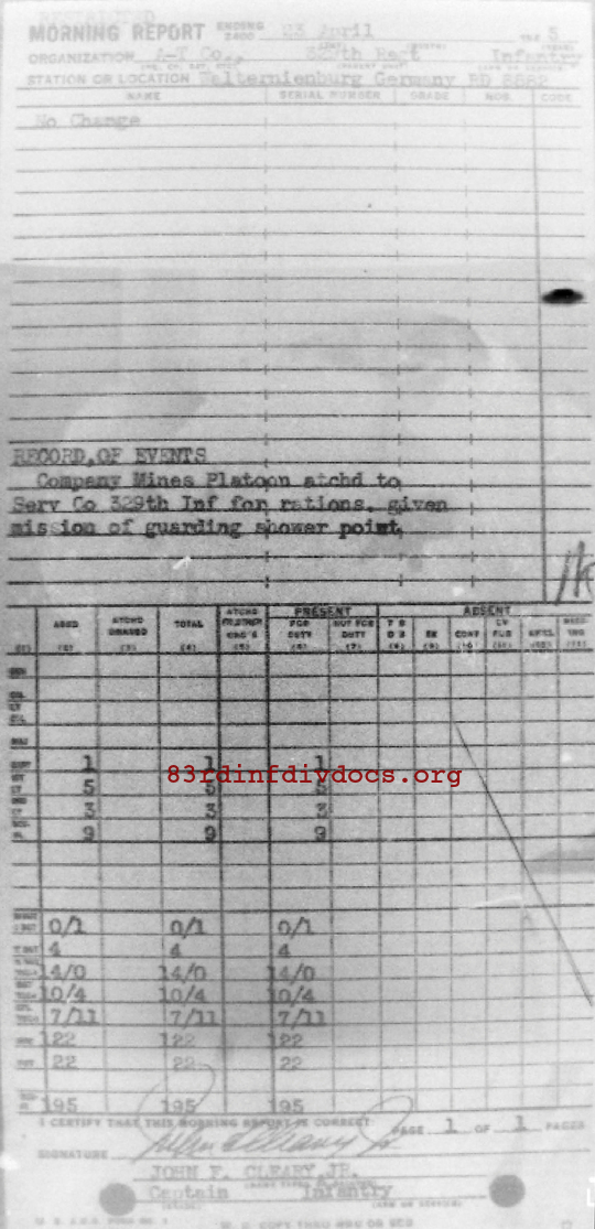 Company Mines Platoon atchd to Serv Co 329th Inf for rations. given mission of guarding shower point