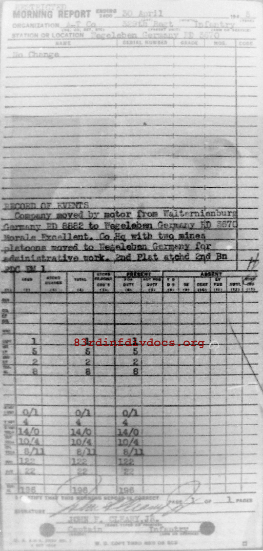Company moved by motor from Walternienburg Germany RD8882 to Wegeleben, Germany RD3670. Morale excellent. Co Hq with two mine platoons moved to Wegeleben Germany for administrative work. 2nd Plat atchd 2nd Bn.