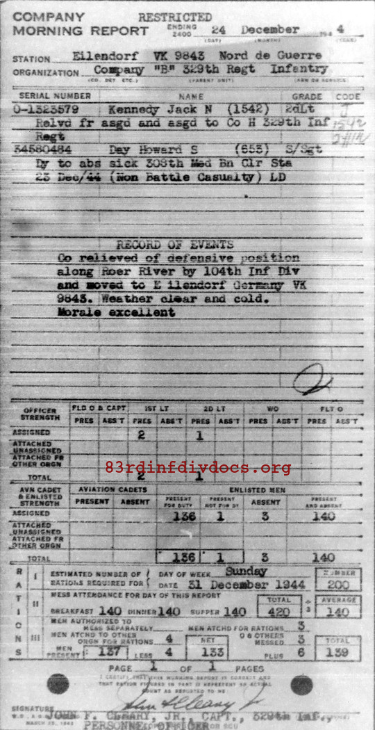 Co relieved of defensive position along Roer River by 104th Inf Div and moved to Eilendorf Germany VK 9842. Weather clear and cold. Morale excellent.