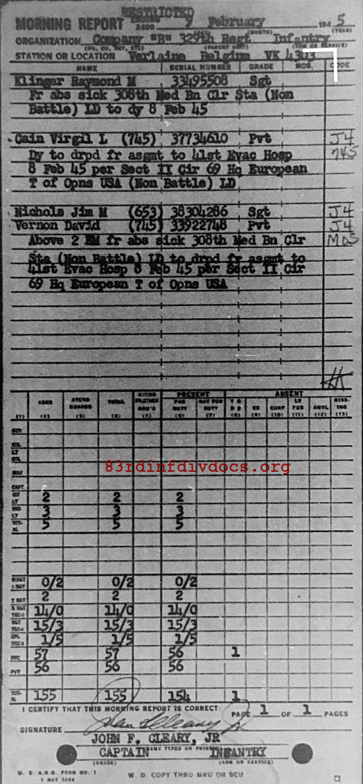 Morning report B/329 for February 9, 1945
