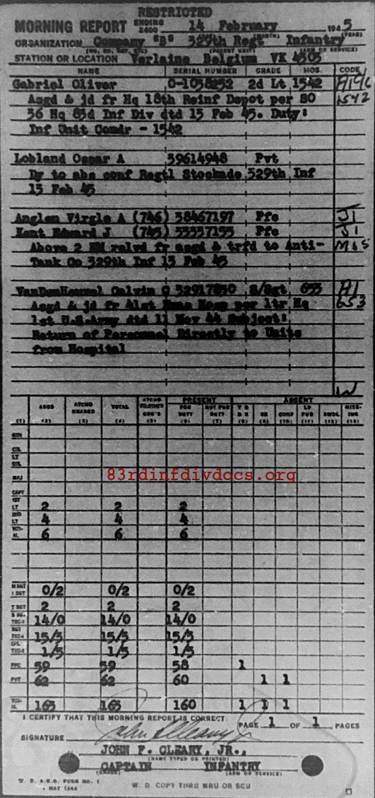 Morning report B/329 for February 14, 1945