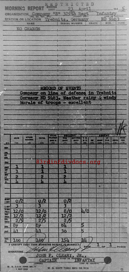 Morning report B/329 for April 23, 1945
