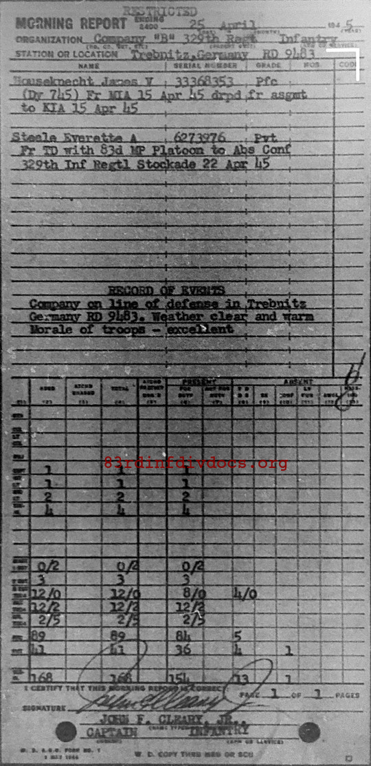 Company on line of defense in Trebnitz, Germany RD9483. Weather clear and warm. Morale of troops - excellent.