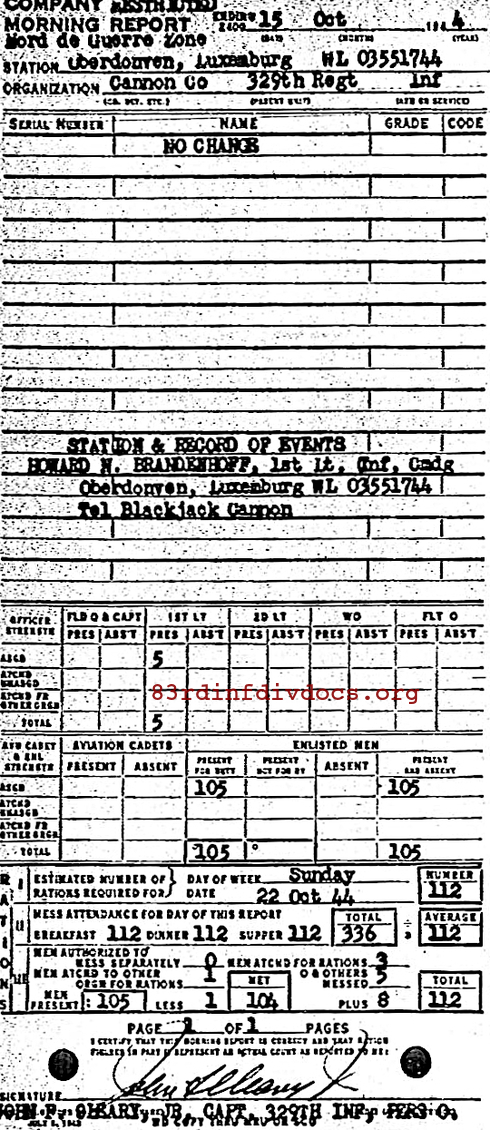 Howard N Brandenhoff, 1st Lt, Inf, Cmdg Oberdonven, Luxemburg wL03551744. Tel Blackjack Cannon