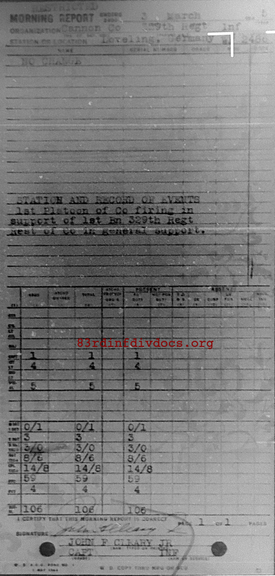 1st Platoon of Co firing in support of 1st Bn 329th Regt. Rest of Co in general support.