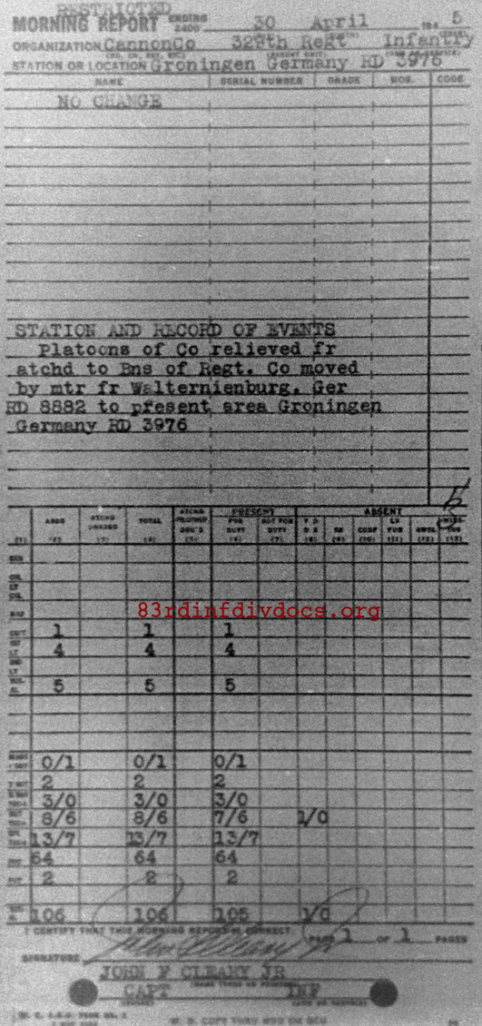 Platoons of Co relieved fr atchd to Bns of Regt. Co moved by mtr fr Walternienburg, Germany RD8882 to present area Groningen, Germany RD3976