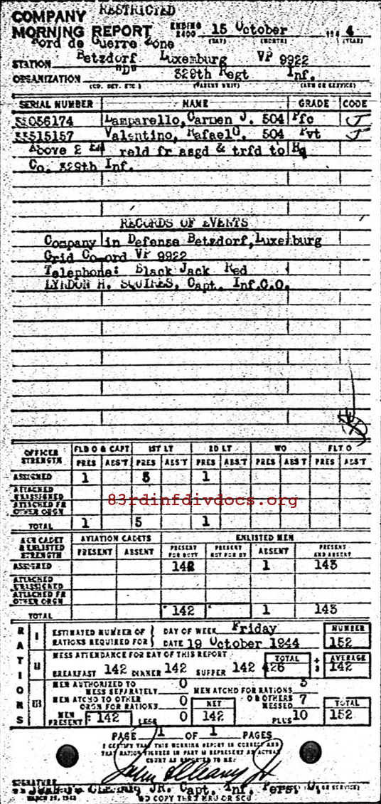 Company in Defense. Betzdorf, Luxemburg. Telephone: Black Jack Red. Lyndon H Squires Capt. Inf. C.O.