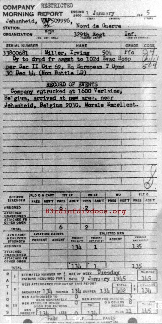 Company entrucked at 1600 Verlaine, Belgium, arrived at new area, near Jenanheid, Belgium 2030. Moral Excellent.