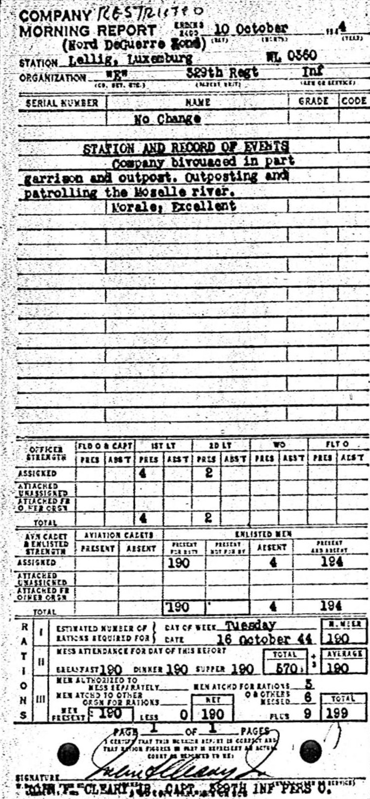 Company bivouaced in part garrison and outpost. Outposting and patrolling the Moselle river. Morale: Excellent.