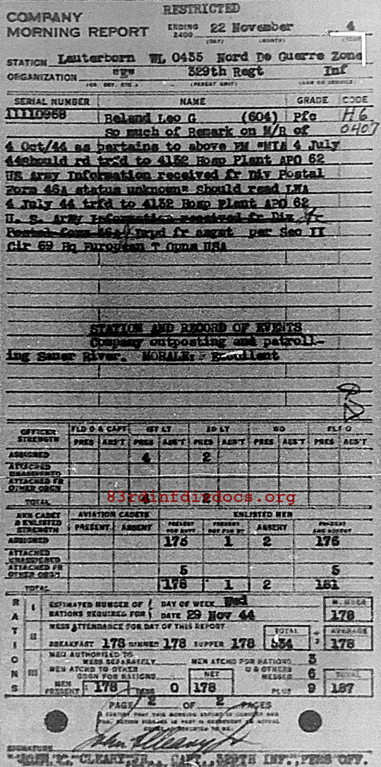 Company outposting and patrolling Sauer River. Morale: Excellent