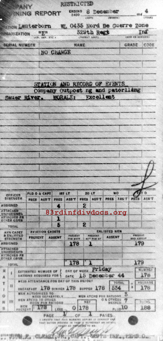 Company outposting and patrolling Sauer River. Morale Excellent.