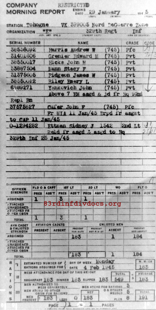 Morning report E/329 for January 29, 1945