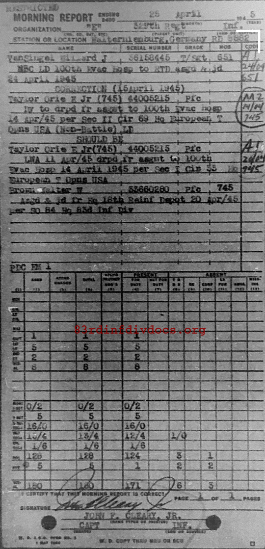 Morning report E/329 for April 25, 1945
