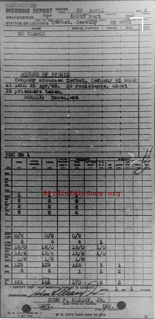 Company attacked Zerbst, Germany RD9882 at 1800 28 Apr/45. No resistance, about 25 prisoners taken. Morale Excellent.