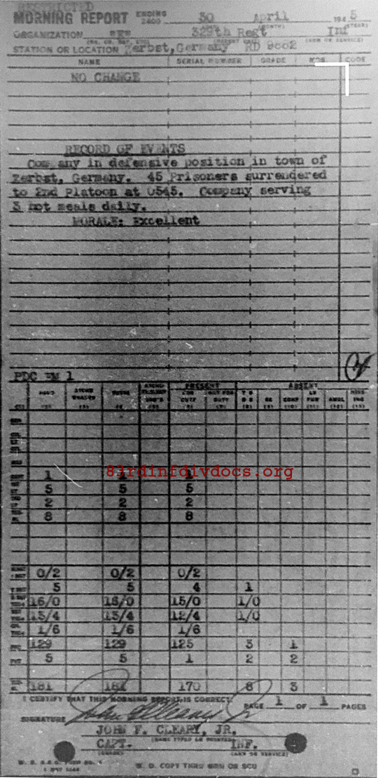 Company in defensive position in town of Zerbst, Germany. 45 Prisoners surrendered to 2nd Platoon at 0545. Company serving 3 hot meals daily. Morale: Excellent.