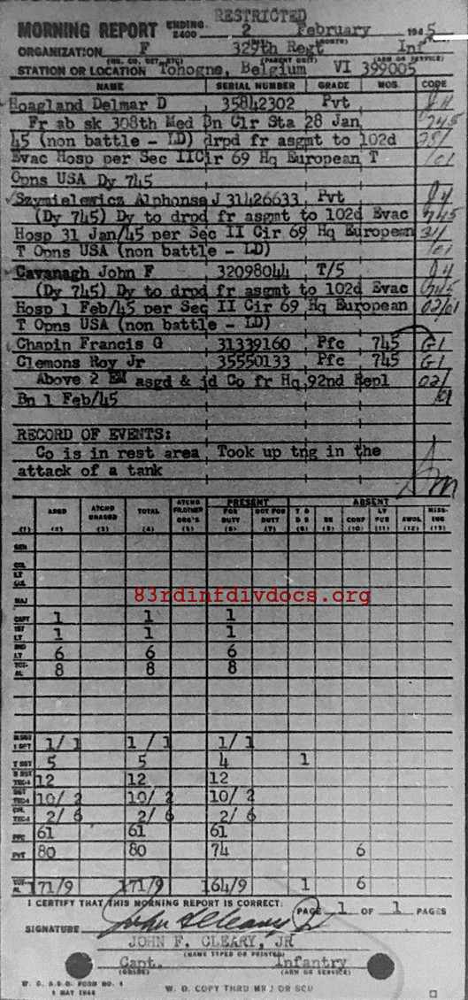 Morning report F/329 for February 2, 1945