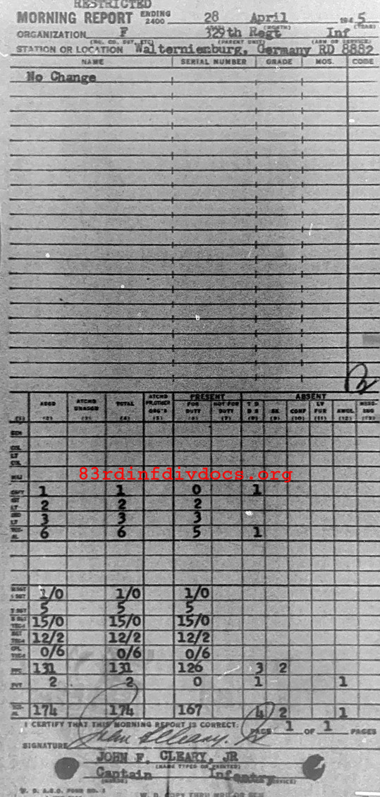 Morning report F/329 for April 28, 1945