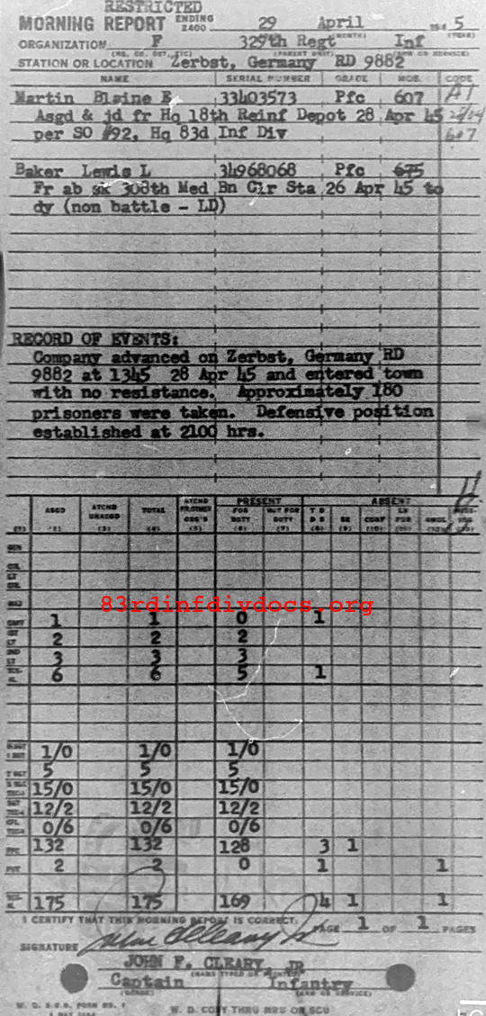 Company advanced on Zerbst, Germany RD 9882 at 1345 28 Apr 45 and entered town with no resistance. Approximately 180 prisoners were taken. Defensive position established at 2100 hrs.