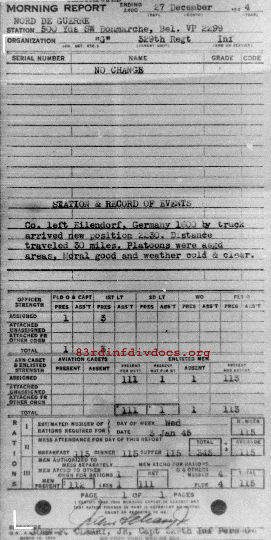Co left Eilendorf, Germany 1600 by truck arrived new position 2230. Distance traveled 30 miles. Platoons were asgd areas. Moral good and weather cold and clear.