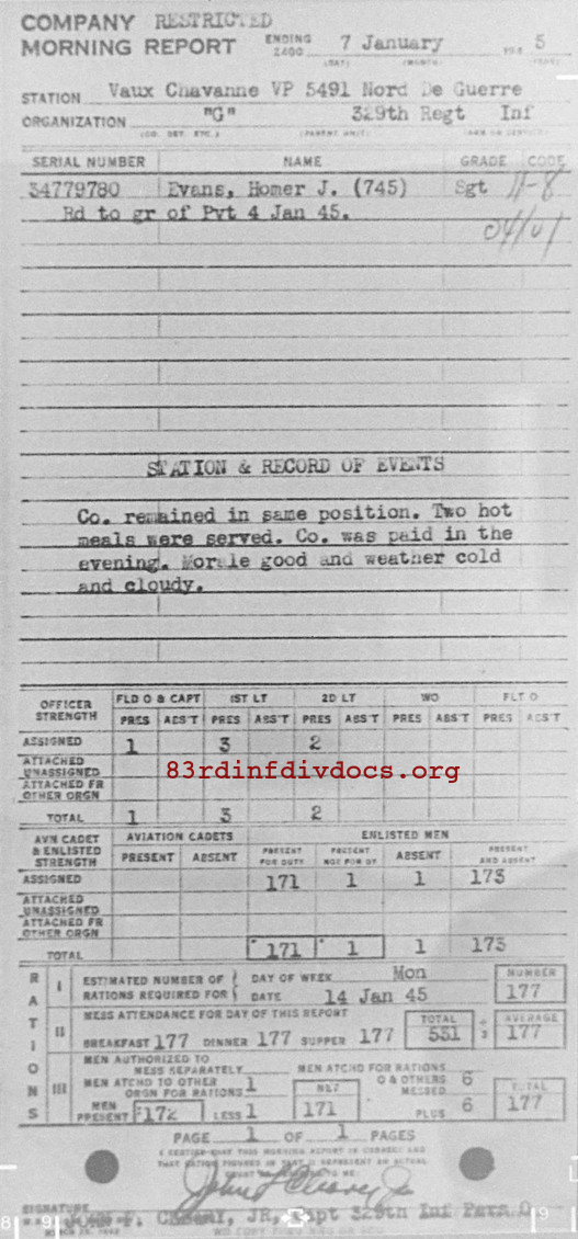 Co remained in same position. Two hot meals were served. Co was paid in the evening. Morale good and weather cold and cloudy.