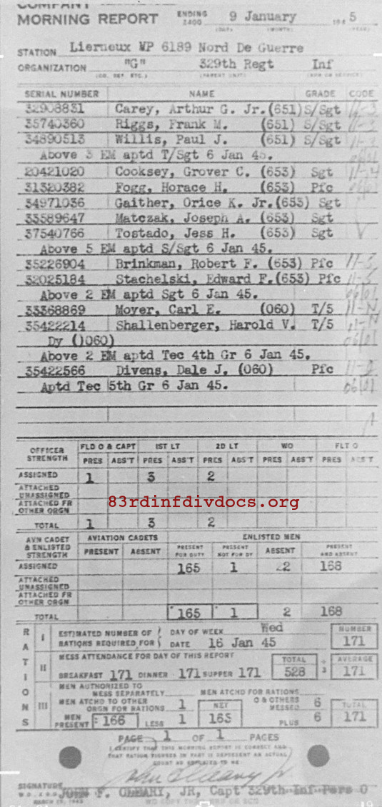 Morning report G/329 for January 9, 1945