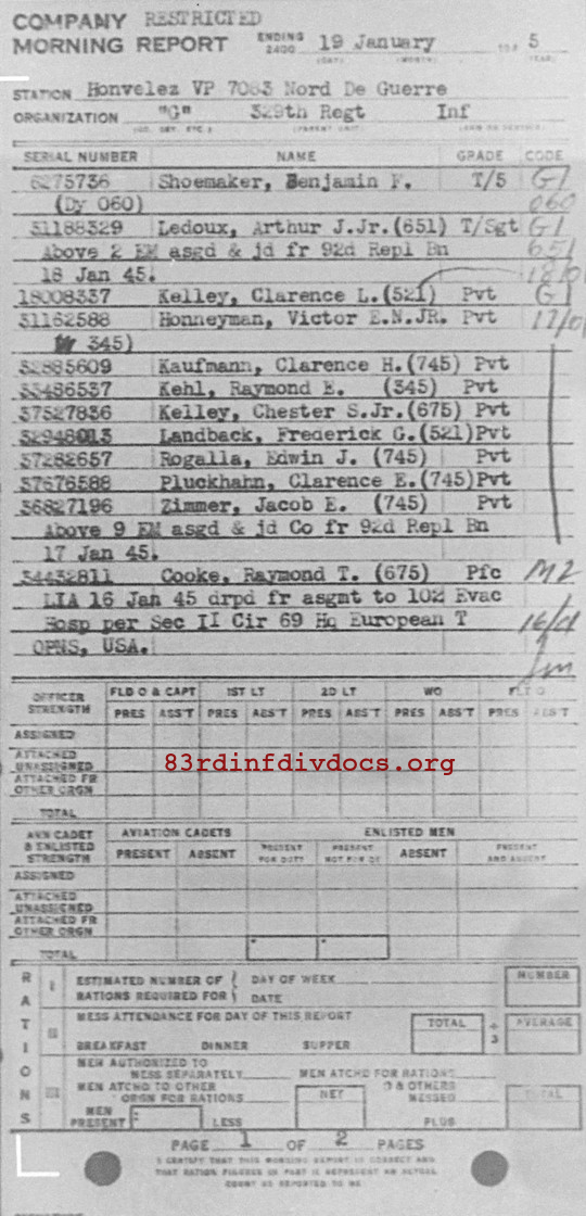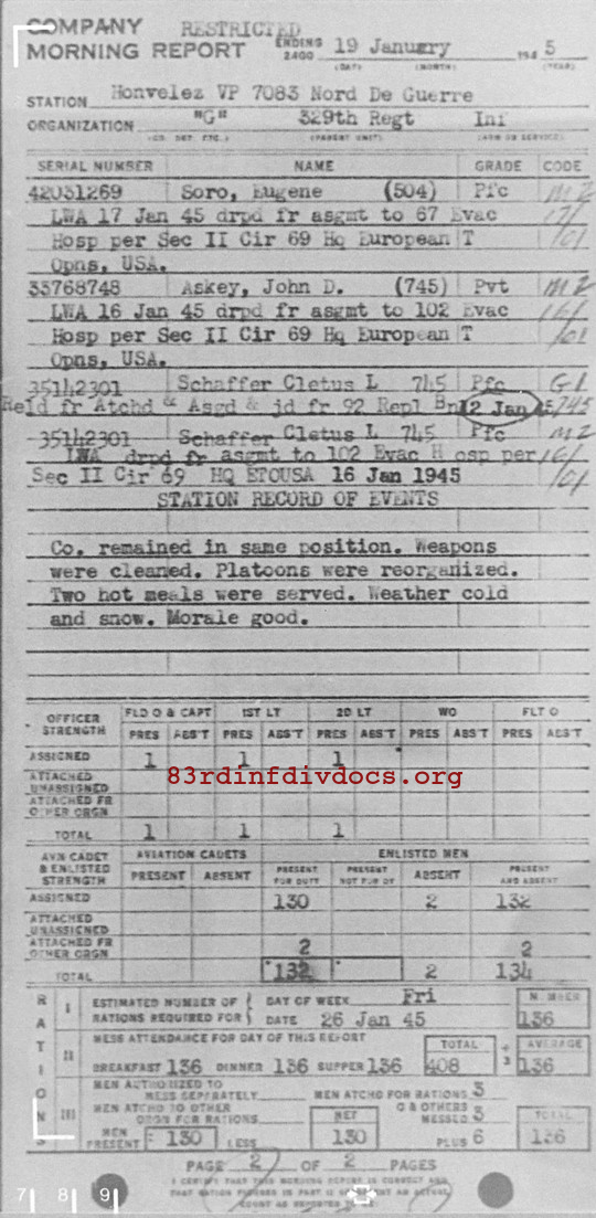 Co remained in same position. Weapons were cleaned. Platoons were reorganized. Two hot meals were served. Weather cold and snow. Morale good.