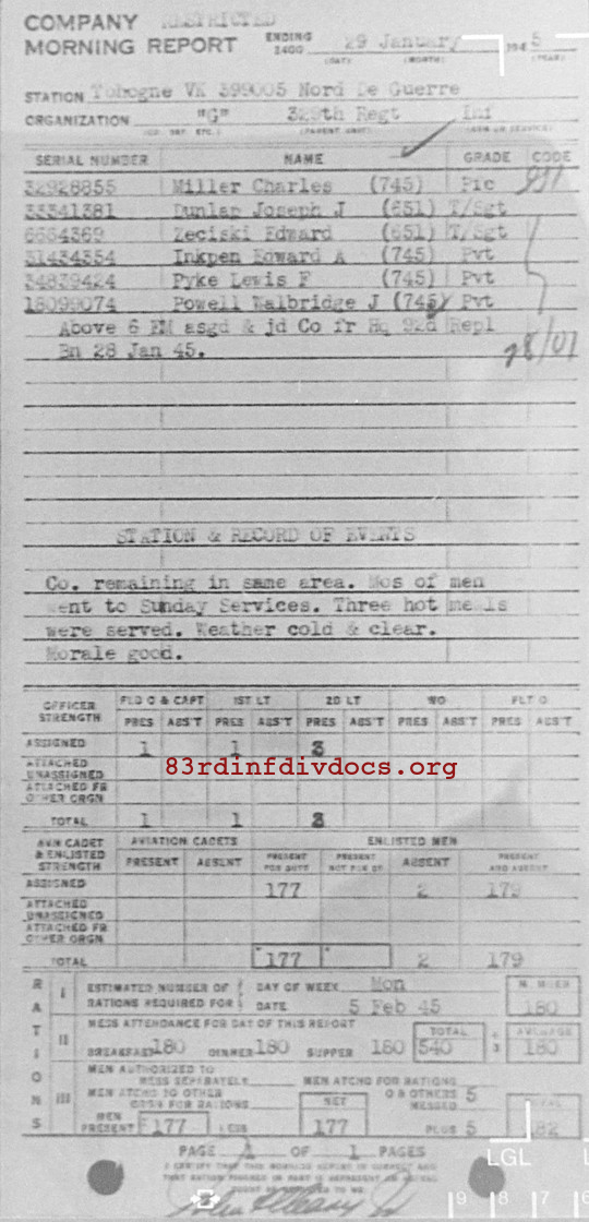 Record of events: Co remaining in same area. Mos of men went to Sunday Services. Three hot meals were served. Weather cold and clear. Morale good.
