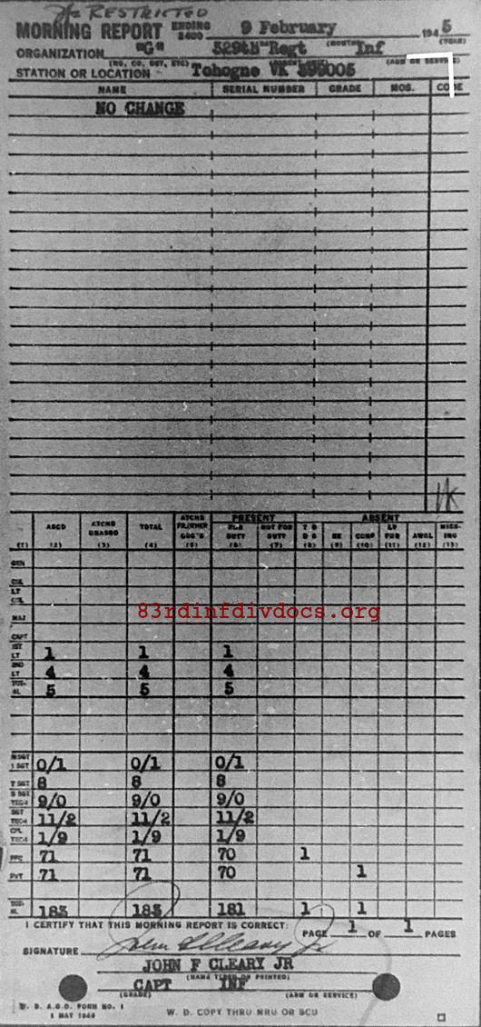 Morning report G/329 for February 9, 1945