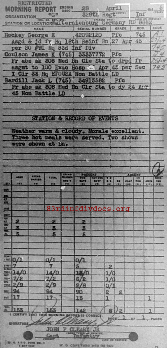 Morning report G/329 for April 28, 1945