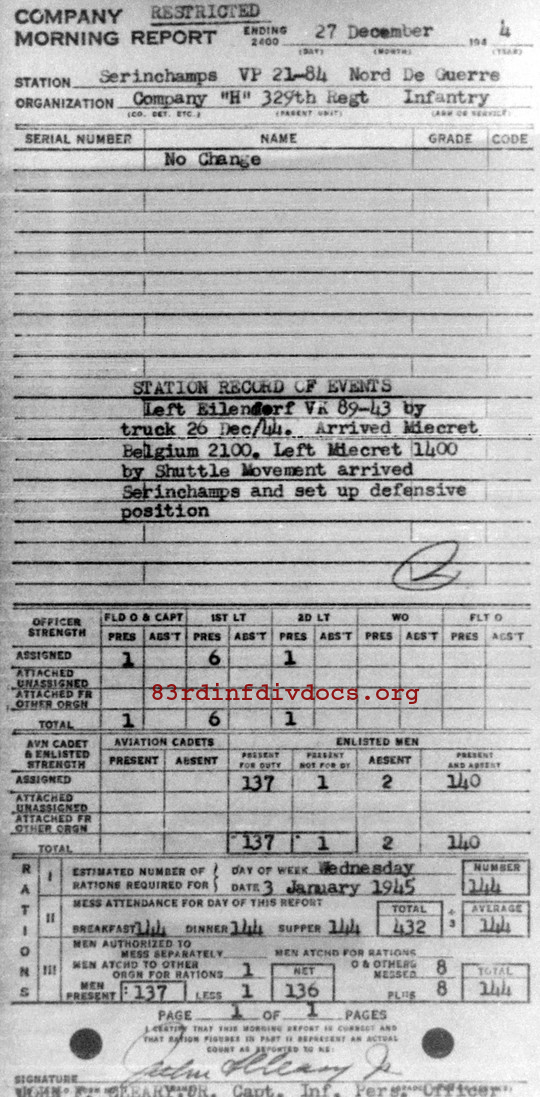 Left Eilendorf VK8943 by truck 26 Dec/44. Arrived Miecret Belgium 2100. Left Miecret 1400 by Shuttle Movement arrived Serinchamps and set up defensive position.