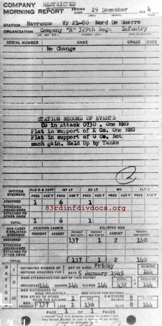 Co in Attack 0730. One HMG Plat in support of E Co. One HMG Plat in support of G Co. Not much gain. Held up by Tanks.