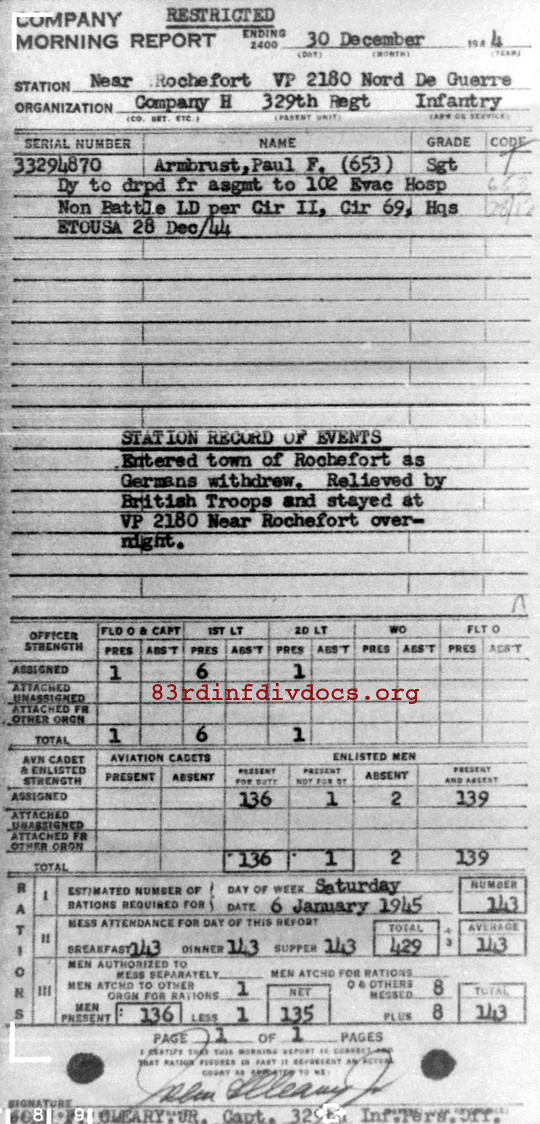 Entered town of Rochefort as Germans withdrew. Relieved by British troops and stayed at VP2180 Near Rochefort overnight.